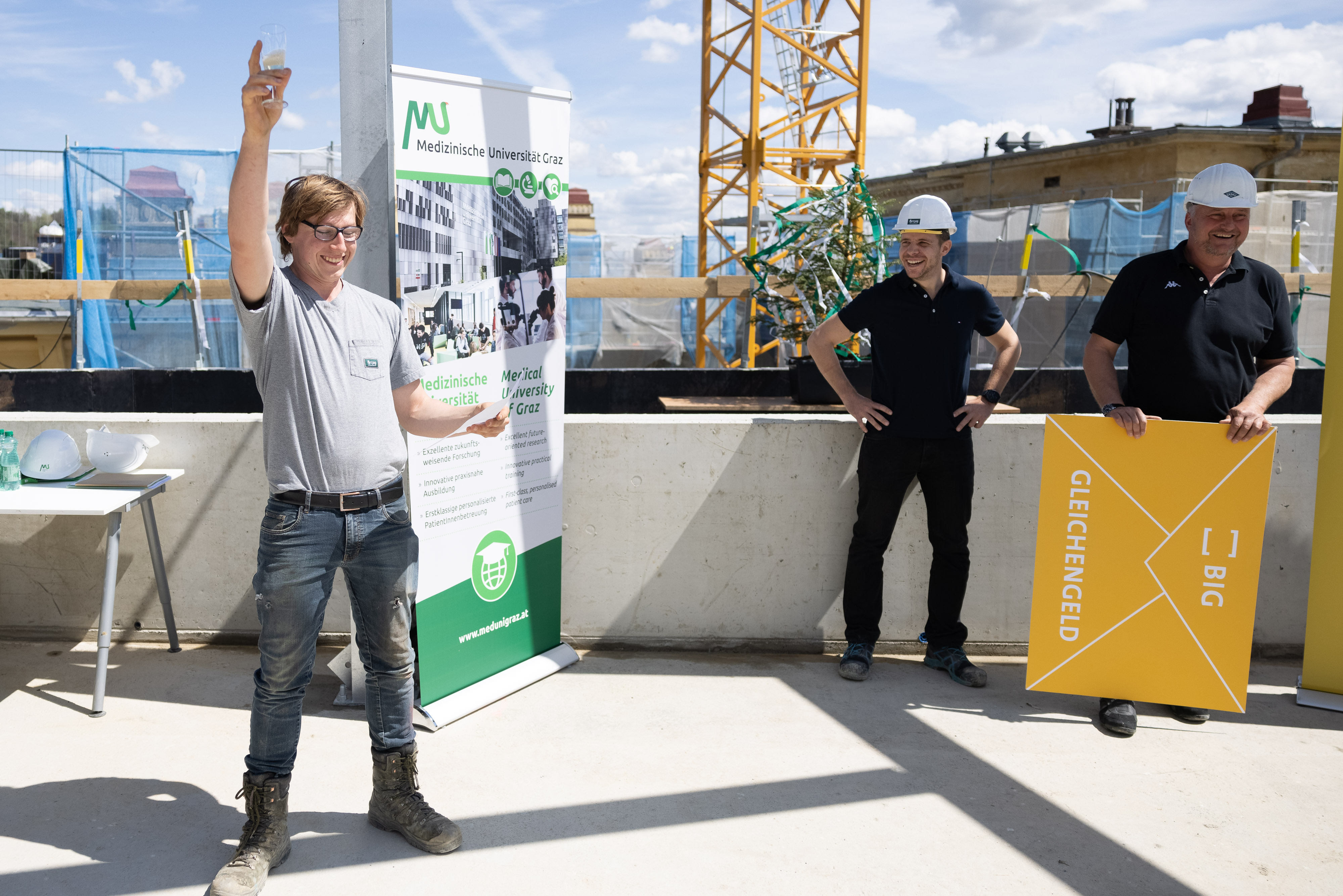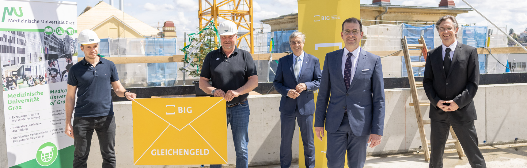 Am 29. April überzeugten sich Hellmut Samonigg, Rektor der Medizinischen Universität Graz, und Hans-Peter Weiss, CEO der Bundesimmobiliengesellschaft, vom Baufortschritt. Anlass waren die Dachgleiche für Modul 2 Ost und für den Lehrstuhl für makroskopische und klinische Anatomie. Bei Modul 2 West läuft seit Oktober 2020 der Innenausbau. Ende 2022 soll das gesamte Areal baulich fertiggestellt sein. Die Inbetriebnahme wird 2023 erfolgen.